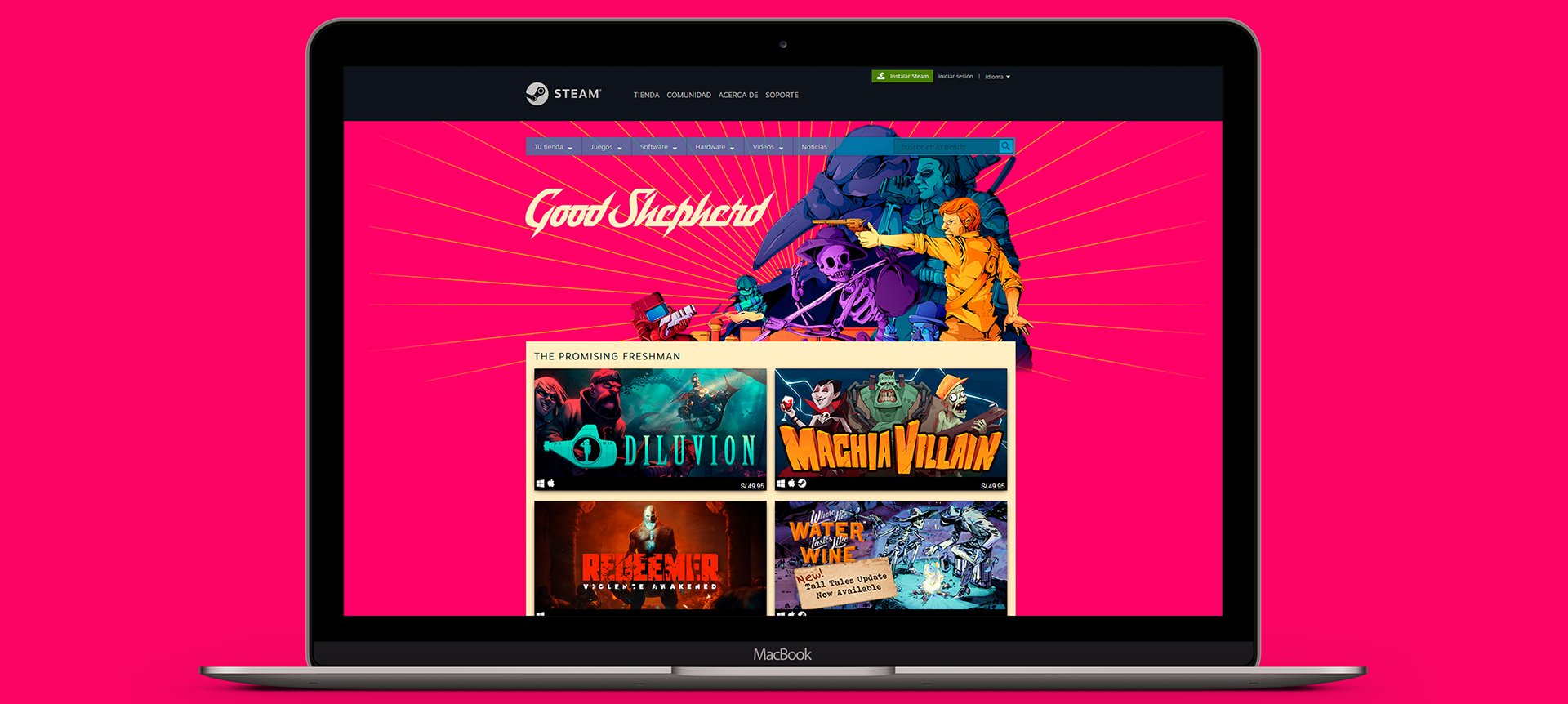 Earlier this year , Good Shepher Entertainment, an independent game publisher, comissioned me with the design for the main artwork for their Publisher Sale on Steam. For this end, the task was to render characters from selected games that were being put on sale in a new and homogeneous style. It was decided that the characters would be stylized in a high contrast style, with a main color for each of them; the artwork was also meant to be used in diverse digital mediums so the detail level on each character should be moderate and legible on different sizes. The artwork had to be able to be reorganized and used in different dimensions and resolutions, which is why each character was developed as a separate asset for future use.